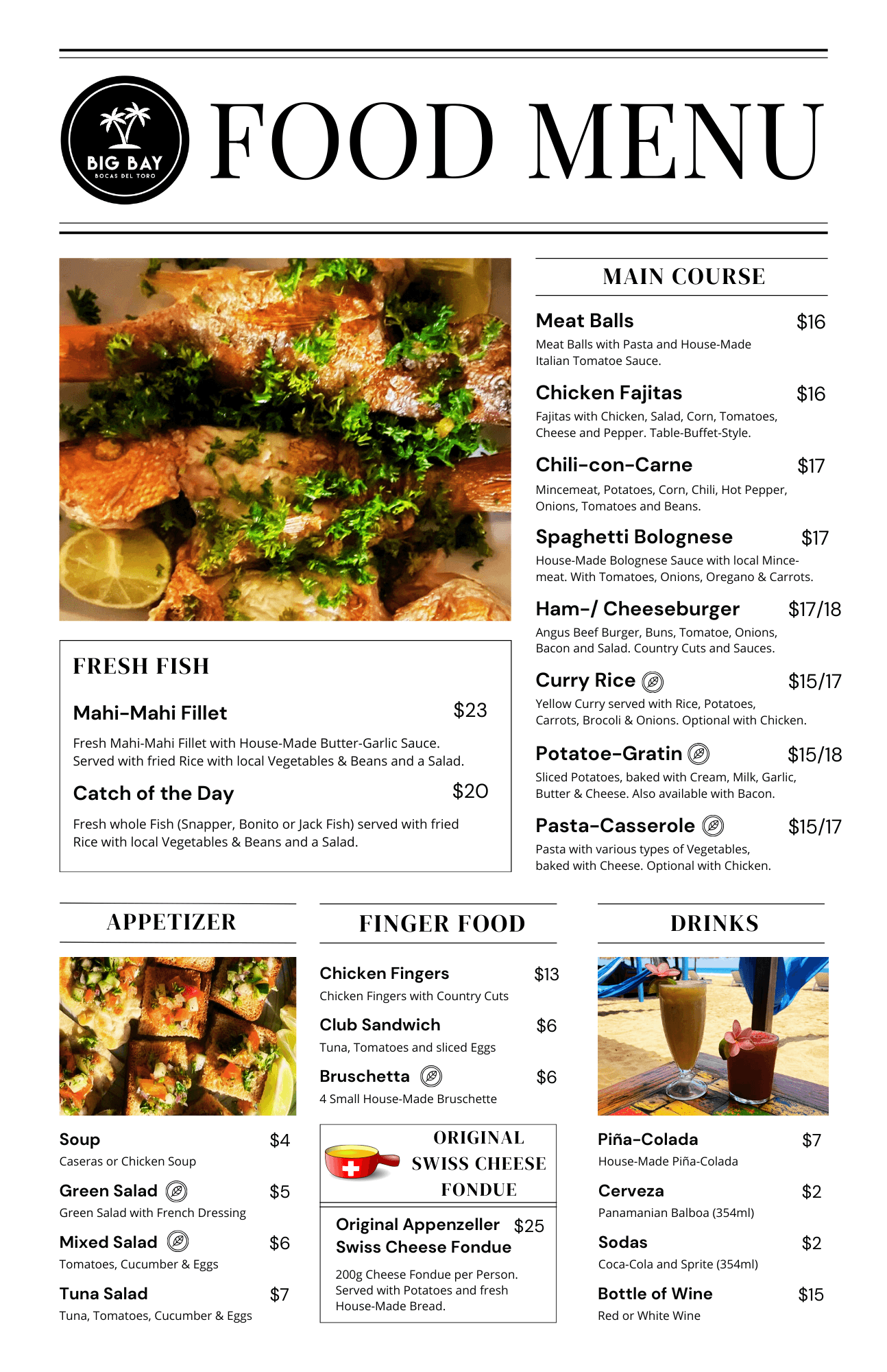 We absolutely love to cook! So we decided to establish a Food Menu for our Guests at Big Bay Bocas. We created a Menu Card mixed with well-known Meals from all around the World. Everything on the Menu is made fresh! We do different House-Made Italian Tomatoe Sauces, House-Made Naan Bred, House-Made French Dressing and House-Made Pina Colada.